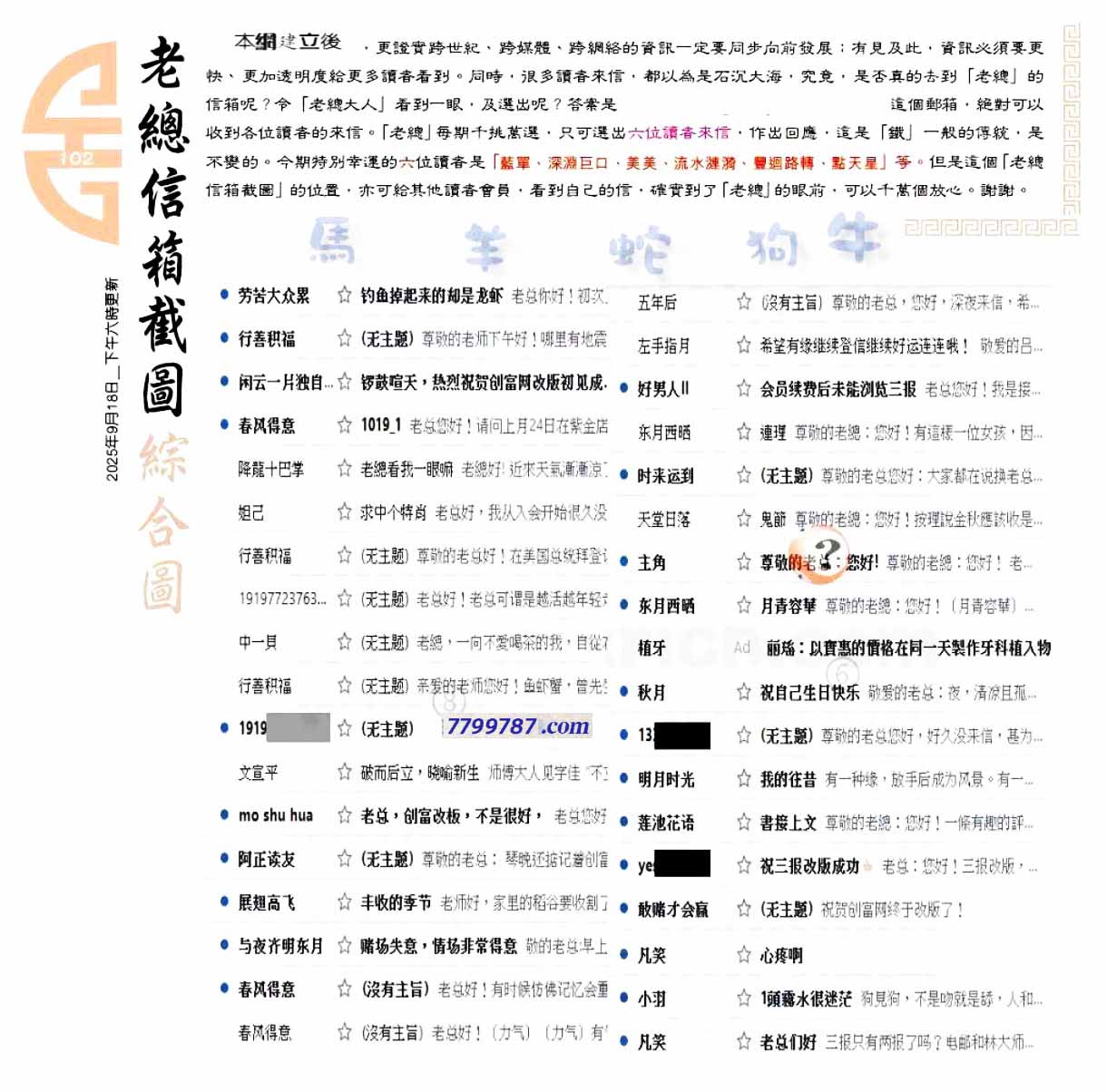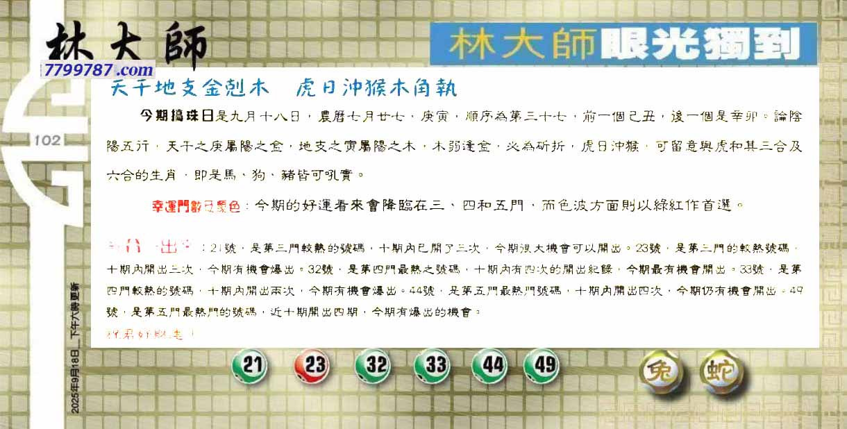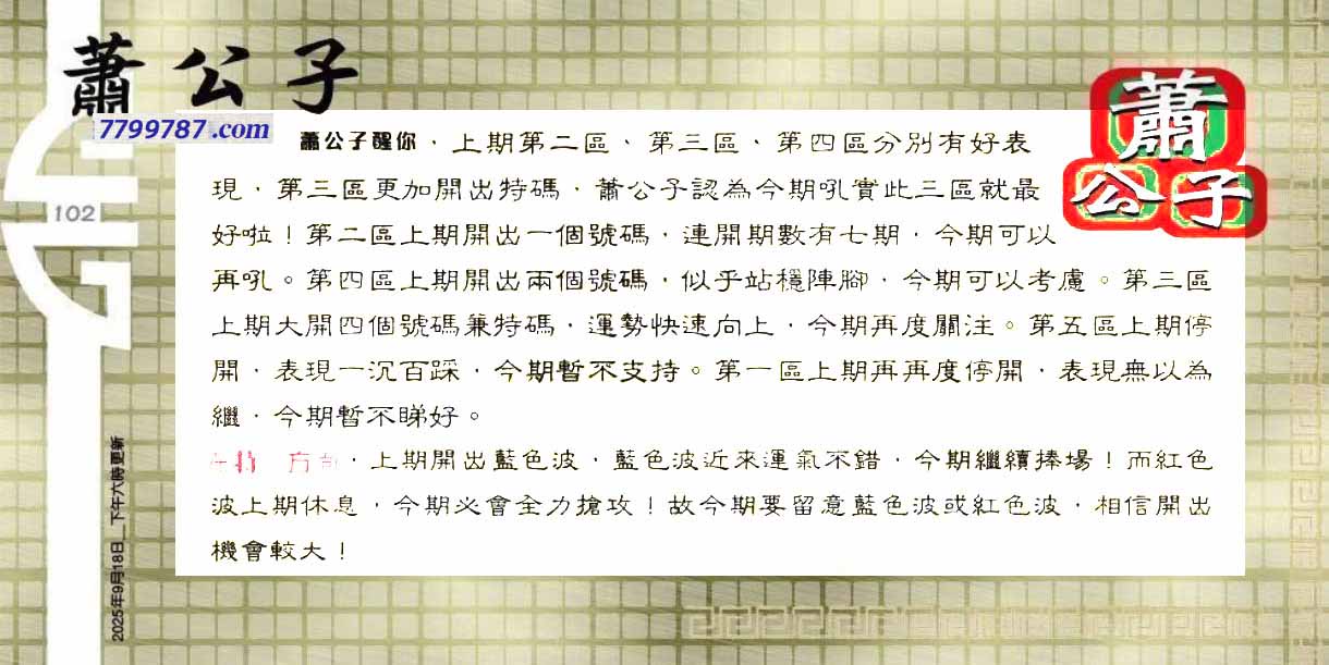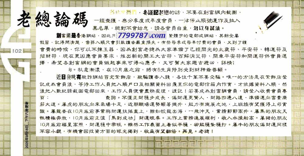 | 主题 :102期:六合皇金句/老总论码/萧公子/林大师/五行夺码/老总信箱截 |
