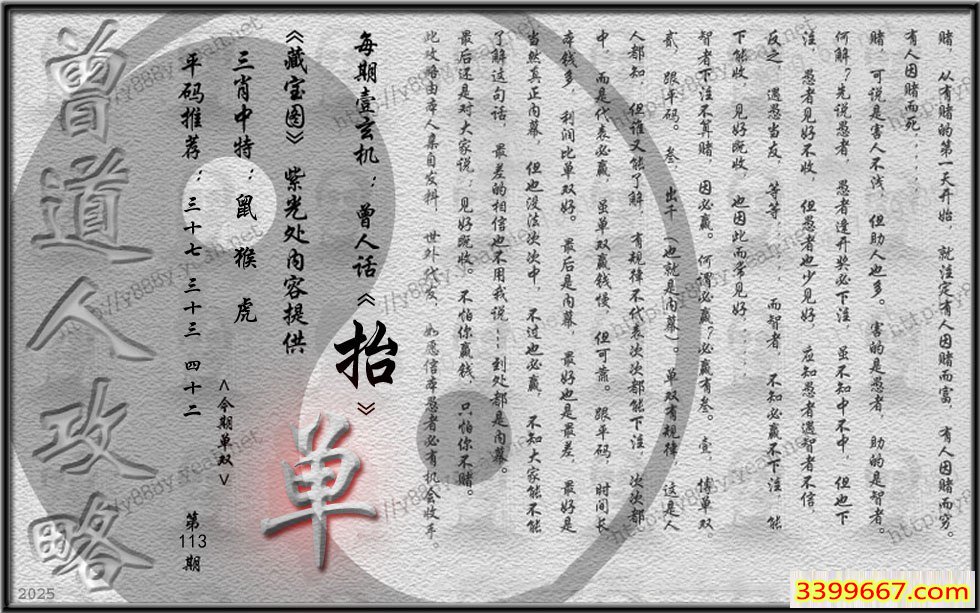 113期藏寶圖 新:歌吹萧条灯火稀 老:莫嫌旧日云中守 禁:虎 禁:0尾 玄機字:《抬》