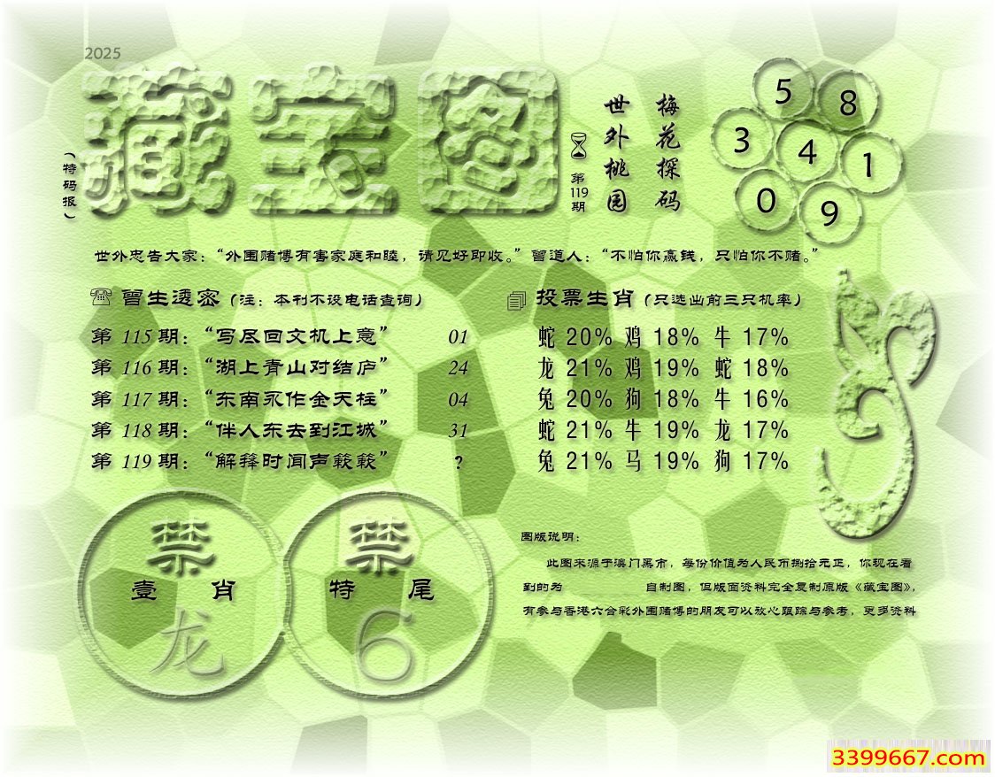 | 主题 :119期藏寶圖 新:壹自鼓山题品后 老:解箨时闻声簌簌 禁:龙 禁:6尾 |