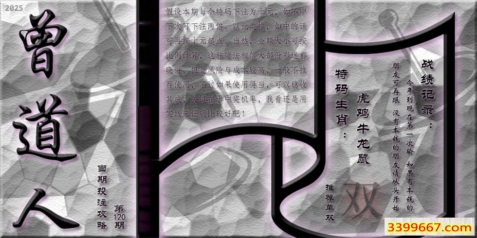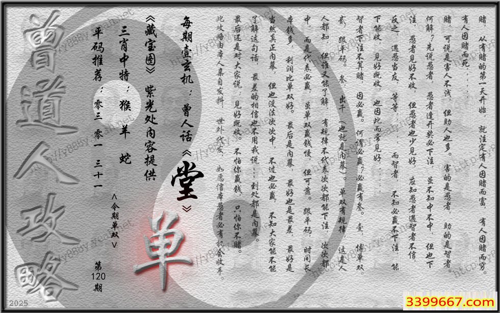 | 主题 :120期藏寶圖 新:荒园茅塞闭墙隈 老:自古骄兵多致败 禁:狗 禁:9 |